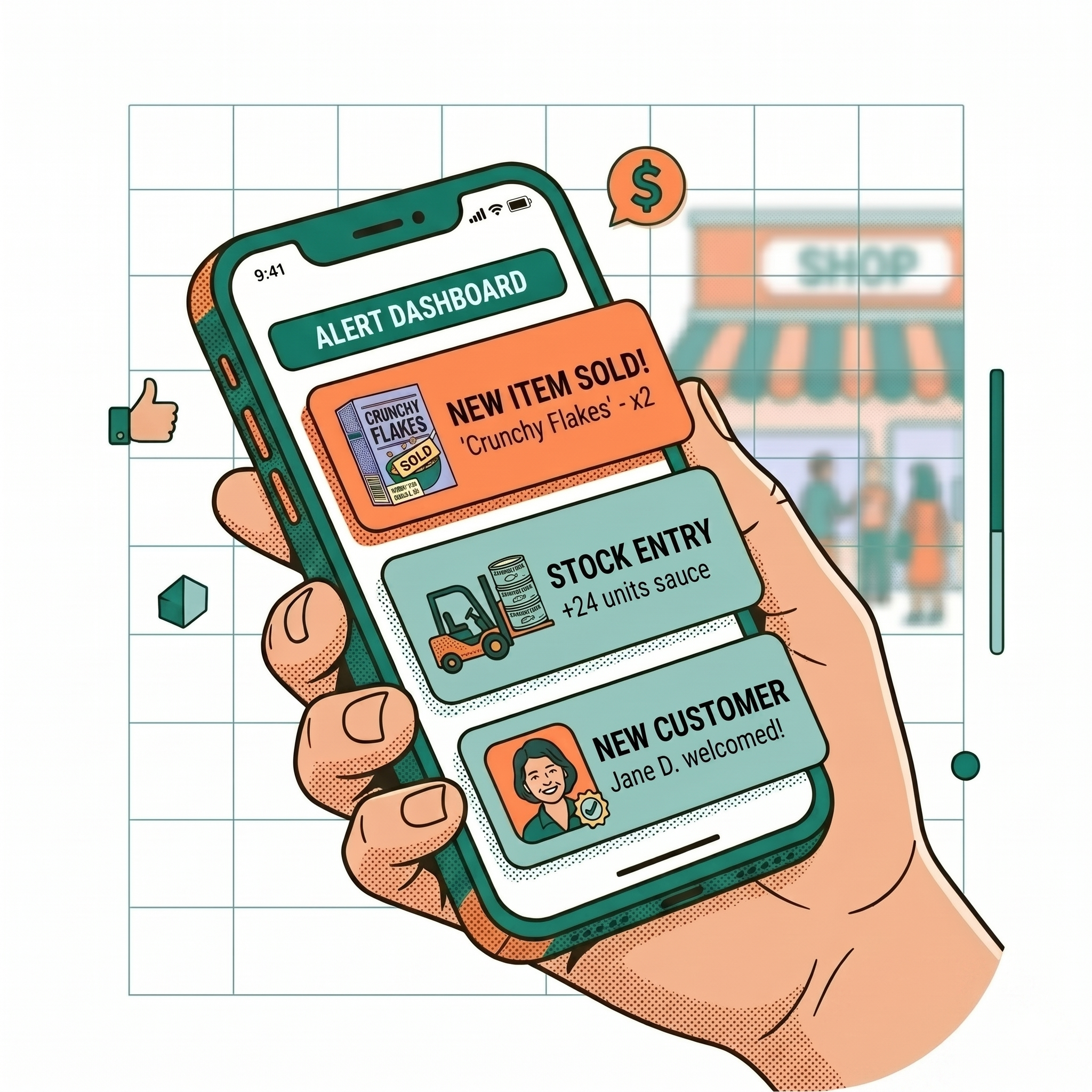 Shop owner will get instant notification in mobile of shop activity from anywhere in the world.